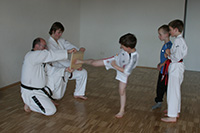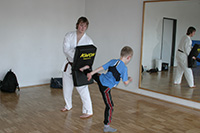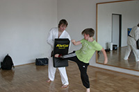 Freitag, 24. Mai: Taekwondo/Gewaltprävension Ein großes Thema in Schulen, auf Spielplätzen oder auf der Straße ist die Gewaltbereitschaft bei Jugendlichen. Die Huchenfelder Veranstalter von kicken&lesen initiierten dafür einem Taekwondo-Kurs, bei dem der Schwerpunkt auf Vermeidung gewalttätiger Auseinandersetzungen, Streitschlichtung sowie den richtigen Umgang mit Konflikten lag . Trotz der Pfingstferien kamen am 24.5.2013 vier Lesekicker zum Taekwondo-Nachmittag. Veranstaltet wurde dieser Kurs in Kooperation mit dem Taekwondo-Verein So-San e.V. in der Schwarzwaldhalle bzw. dem Spiegelsaal in Schellbronn. Markus Kasper (3.Dan) leitete die Gruppe und vermittelte viel Wissen über Theorie und Praxis von Taekwondo. Die Lesekicker diskutierten über Notwehr, Gewalt im täglichen Leben und wie man Konflikten frühzeitig deeskalieren kann. Jonas, Lukas und Ute Kasper unterstützten den Kurs mit Aufwärmtraining, Gymnastik sowie das Halten von Pratzen und Brettern. Nach ein paar Grundtechniken konnten die Lesekicker schon die 1. Kreuzform laufen und einige Kicks auf die Pratzen schlagen. Danach wurden verschiedene Falltechniken geübt. Zum Abschluss konnten die Jungs versuchen, ein Bruchtestbrett per Fußkick durchzuschlagen. Der Nachmittag war für die Jungs sehr interessant, abwechslungs- und lehrreich. Leider vergingen die Stunden wie im Fluge und gegen 19.30 Uhr wurden die Kids nach Hause gebracht.